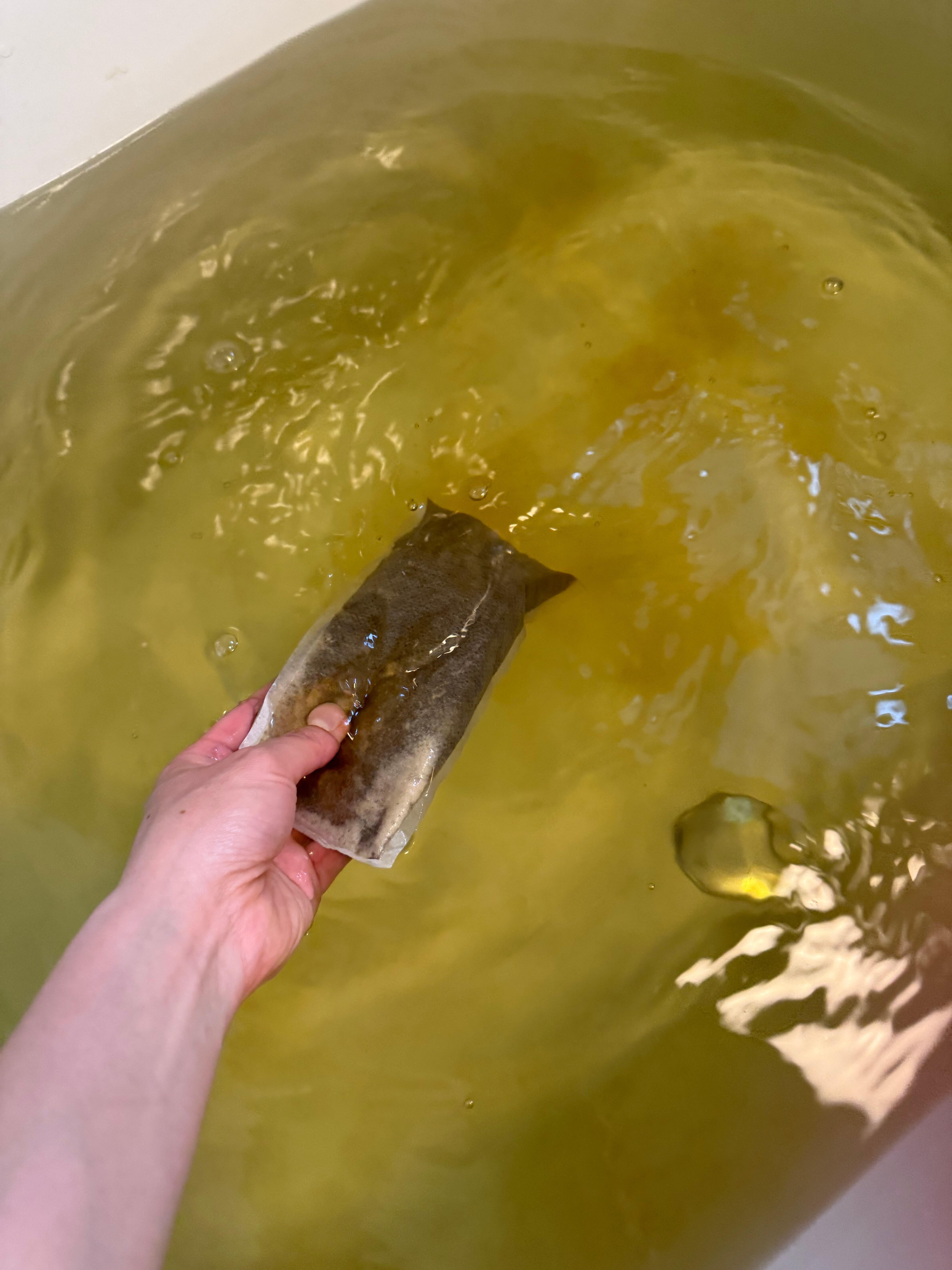 ③火を止めて少し蒸らし、抽出液とパックごと浴槽へ入れる